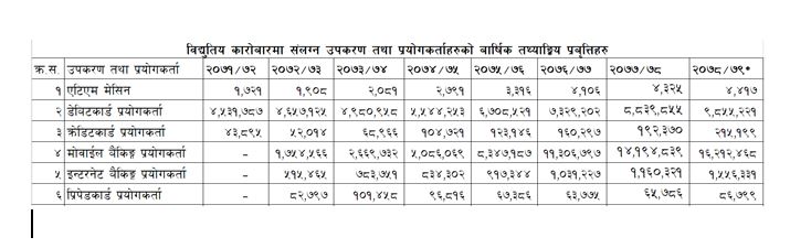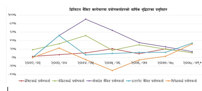 नियामक निकायले प्रकाशन गरेका तत्थ्यहरुको आधारमा माथि उल्लेखित शीर्षकहरुका पछिल्ला केही वर्षका प्रबृत्तिहरु हेर्दा मोवाइल बैंकिङ सेवा, ई–वालेट सेवा तथा डेविटकार्ड सेवा तर्फ प्रयोगकर्ताहरुको चाप उच्चरुपमा बढ्दै गरेको देखिन्छ । पछिल्ला तत्थ्याङ्कहरु हेर्दा नेपालमा १ करोड ६२ लाखभन्दा धेरै मोवाइल बैंकिङका प्रयोगकर्ताहरु छन्, त्यस्तै १ करोडभन्दा धेरै ई–वालेट सेवाग्राहीका साथै करिब ९९ लाख डेविटकार्ड प्रयोगकर्ताहरु रहेका छन् ।