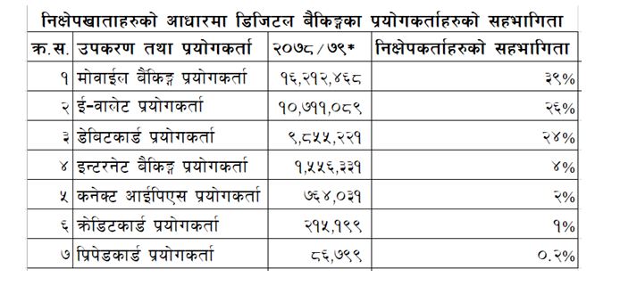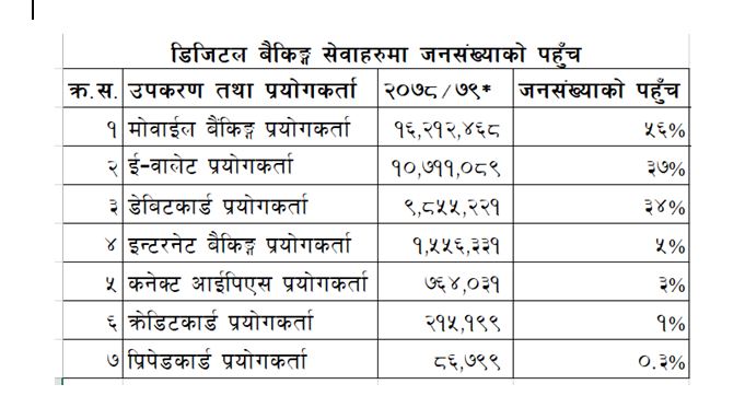बैंक तथा वित्तिय संस्थाहरुमा चालु आर्थिक वर्षको पुस मसान्तसम्ममा कायम रहेको निक्षेपकर्ताहरुको आधारमा हेर्दा ३९ प्रतिशत निक्षेपकर्ताहरुले मोवाइल बैंकिङ सेवा उपयोग गरिरहेका छन् भने २६ प्रतिशत निक्षेपकर्ताहरुले ई–वालेट प्रयोग गरिरहेको देखिन्छ । त्यसैगरी डेविटकार्ड प्रयोगमा २४ प्रतिशत निक्षेपकर्ताहरुको सहभागिता देखिन्छ। राष्ट्रिय जनगणना २०७८ का प्रारम्भिक नतिजा अनुसारको २ करोड ९१ लाखको जनसंख्याका आधारमा डिजिटल बैंकिङ सेवा प्रयोगकर्ताहरुको औसत पहुँचको अवस्थालाई केलाउँदा निम्न बमोजिमको तत्थ्याङ्किय तर्कहरु भेटिन्छन् ।