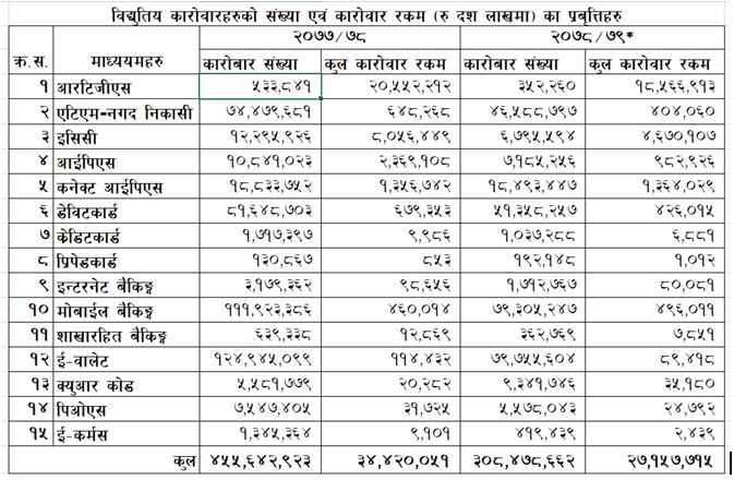 गत आर्थिक वर्षदेखि चालु आर्थिक बर्षको पौष मसान्तसम्मका नेपाल राष्ट्र बैंकबाट प्रकाशित तथ्यहरु हेर्दा नेपालको विद्युतीय कारोबार संख्या एवं कारोबार रकम निम्न बमोजिम कायम रहेको देखिन्छ ।