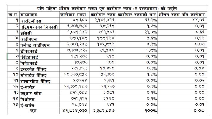 यस्तै प्रतिदिन औसतमा १२ लाख ४८ हजार कारोबारहरु डिजिटल बैंकिङका माध्ययमबाट भैरहेका देखिन्छन् भने नेपाली बैकिङ्गमा कायम तलरताको अवस्थालाई परिवर्तन गर्न सक्ने साइजमा विद्युतीय कारोबारहरु नियमितरुपमा भैरहेको तत्थ्याङ्कहरुबाट प्रष्टिन्छ । कारोबार संख्याका आधारमा ई–वालेट र मोवाइल बैकिङ्गबाट हुने कारोबार संख्या अत्याधिक छन् भने कारोबार रकमको आधारमा आरटिजीएस अग्रस्थानमा देखिन्छ । यस्तै प्रबृत्तिहरु चालु आर्थिक वर्षको पुस मसान्तसम्मका तथ्यहरुमा समेत बिम्बित भएका छन् । उपलब्ध १८ महिनाका तथ्यहरुको आधारमा नेपालमा प्रत्येक महिना निम्न बमोजिम औसतमा विद्युतीय कारोबार हुने गरेका छन् ।