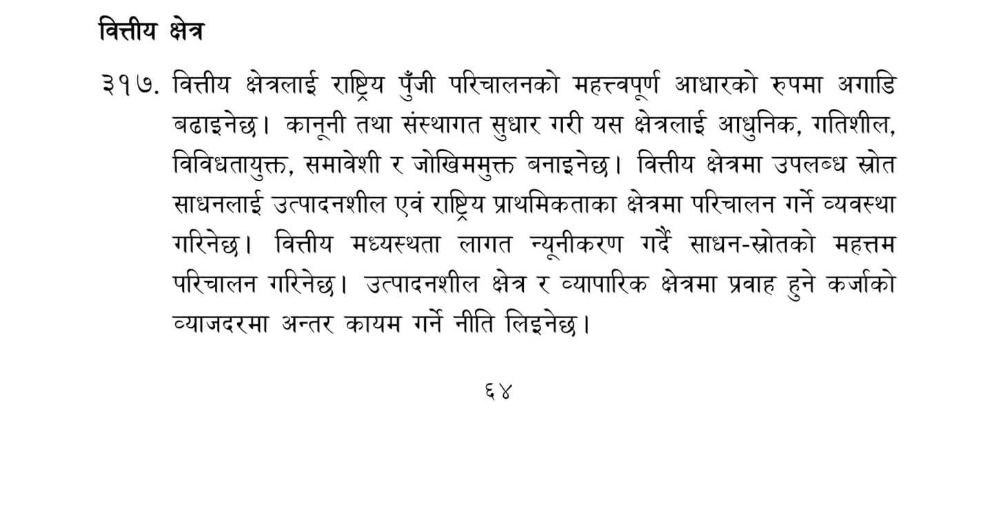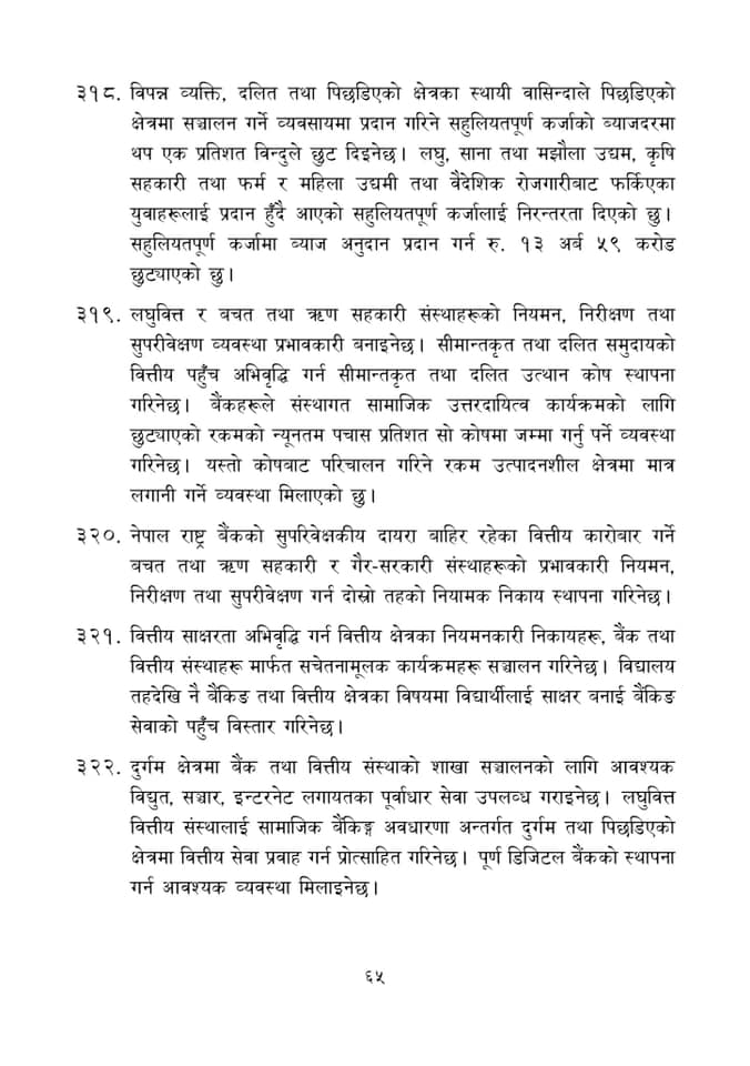 सहुलियत कर्जामा ब्याज अनुदान दिन १३ अर्ब ५९ करोड रुपैयाँ विनियोजन गरिएको छ । बीमा कम्पनीले निश्चित प्रतिशत पूर्वाधार आयोजनामा लगानी गर्नुपर्ने व्यवस्था गरिने भएको छ । धितोपत्रको दोस्रो बजारमा गैर आवासीय नेपालीलाई लगानीका लागि कानुनी व्यवस्था गरिने भएको छ ।