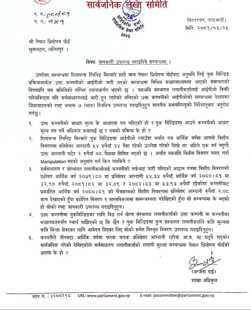 मिल्सले सेबोनबाट अनुमति लिई बुक बिल्डिङ विधिबाट आईपीओ जारी भएको सम्बन्धमा विभिन्न सञ्चारमाध्यममा आएको समाचारको विषयप्रति लेखा समितिको गम्भीर ध्यानाकर्षण भएको जनाउँदै प्रश्न उठाएको छ । यसअघि संस्थागत लगानीकर्तालाई आईपीओ बिक्री गरिसके पनि सर्वसाधारणलाई जारी हुन लागेको भनिएको रिलायन्स स्पिनिङको आईपीओको सम्बन्धमा ७ दिनभित्र स्पष्ट जवाफ पठाउन सेबानलाई लेखा समितिले निर्देशन दिएको छ ।