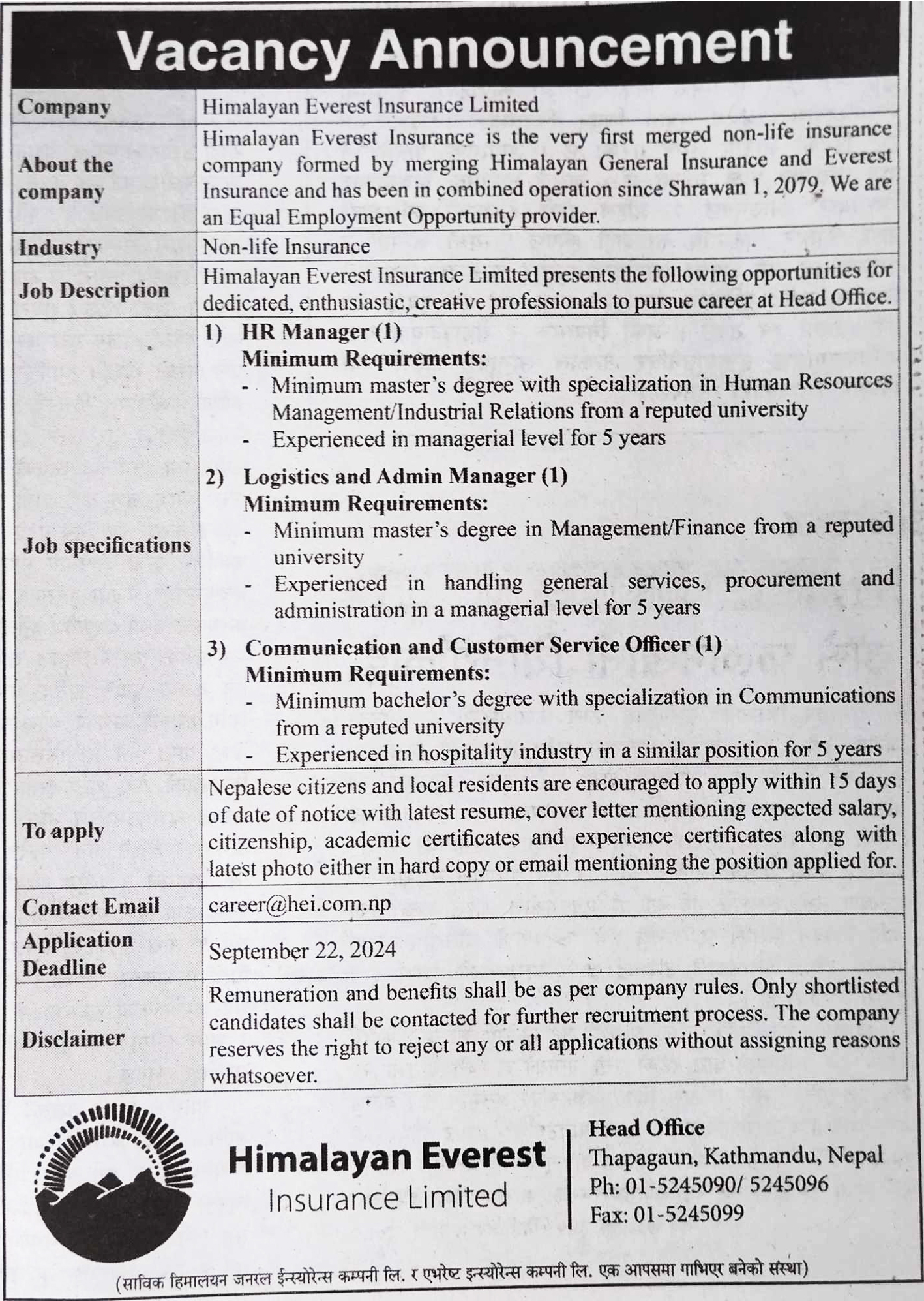 बैंकिङ खबर/ निर्जीवन बीमा कम्पनी हिमालयन एभरेष्ट इन्स्योरेन्स लिमिटेड कर्मचारी माग गरेको छ । कम्पनीले एआर म्यानेजर, लजिस्टिक एनड एडमिन म्यानेजर र कम्युनिकेसन एन्ड कस्टरम सर्भिस अफिसर पदमा पदपूर्ति गर्ने गरी कर्मचारी माग गरेको हो । कम्पनीले उल्लिखित तीनवटै पदमा १/१ जना कर्मचारीबाट दरखास्त माग गरेको छ ।