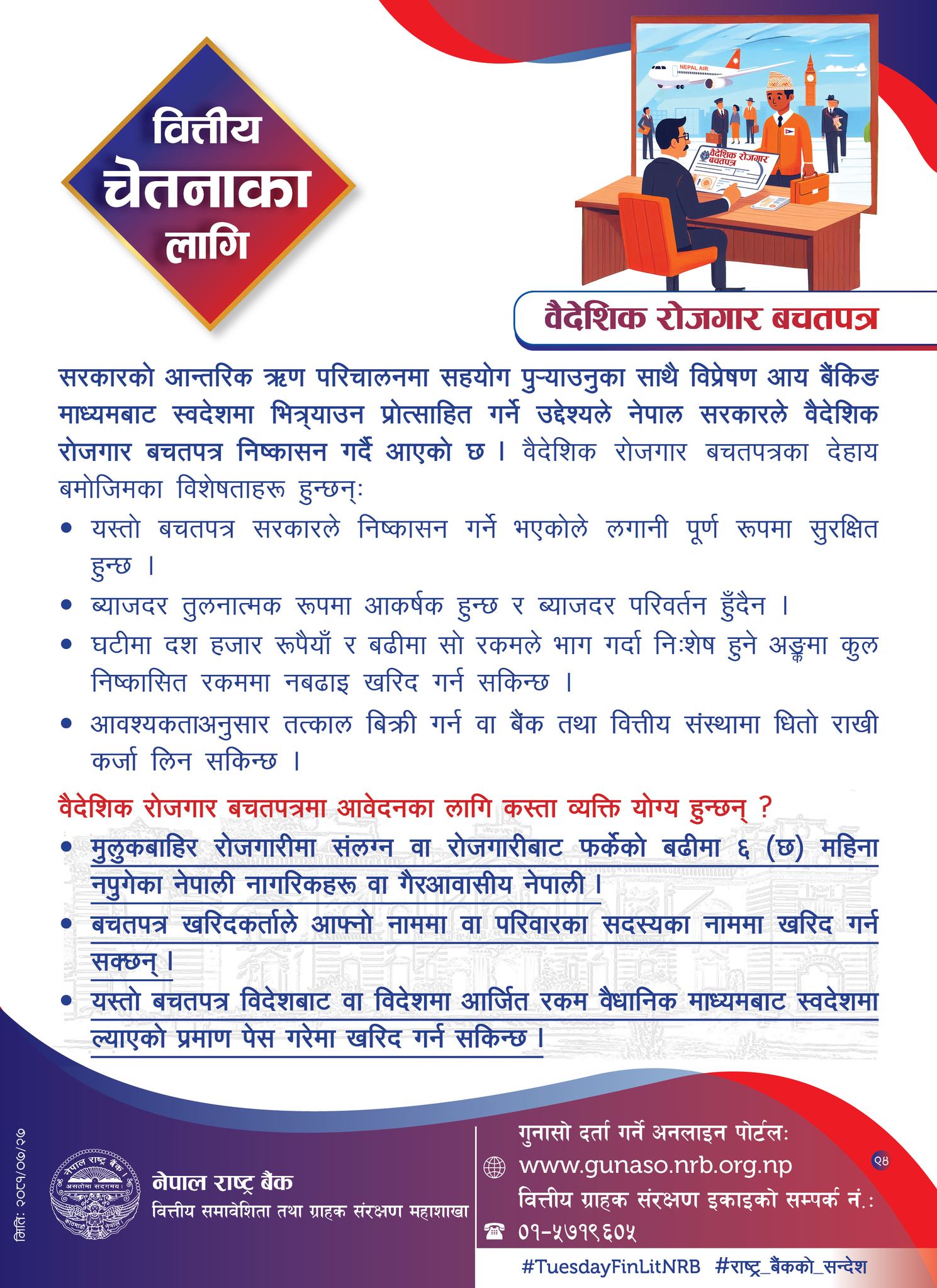 बैंकिङ खबर/ सरकारको आन्तरिक ऋण परिचालनमा सहयोग पुर्याउनका लागि साथै विप्रेषण आय बैंकिङ माध्यमबाट स्वदेशमा भित्र्याउन प्रोत्साहित गर्ने उद्देश्यले नेपाल सरकारले वैदेशिक रोजगार बचतपत्र निष्कासन गर्दै आएको छ । वैदेशिक रोजगार बचतपत्रका देहाय बमोजिमका विशेषताहरु हुन्छन् :
