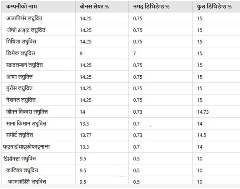 यस वर्ष कुल १५ वटा लघुवित्त कम्पनीहरुको १० प्रतिशतमाथि लाभांश रहेको छ । जसमा आत्मनिर्भर, नेष्डो समृद्ध, मिथिला, छिमेक, स्वावलम्बन, आशा, गुराँस र नेशनल लघुवित्तको १५ प्रतिशत लाभांश रहेका छन् । त्यस्तै, जीवन विकास, साना किसान र सपोर्ट माइक्रोफाइनान्सको १४ प्रतिशतबढी लाभांश रहेको छ।