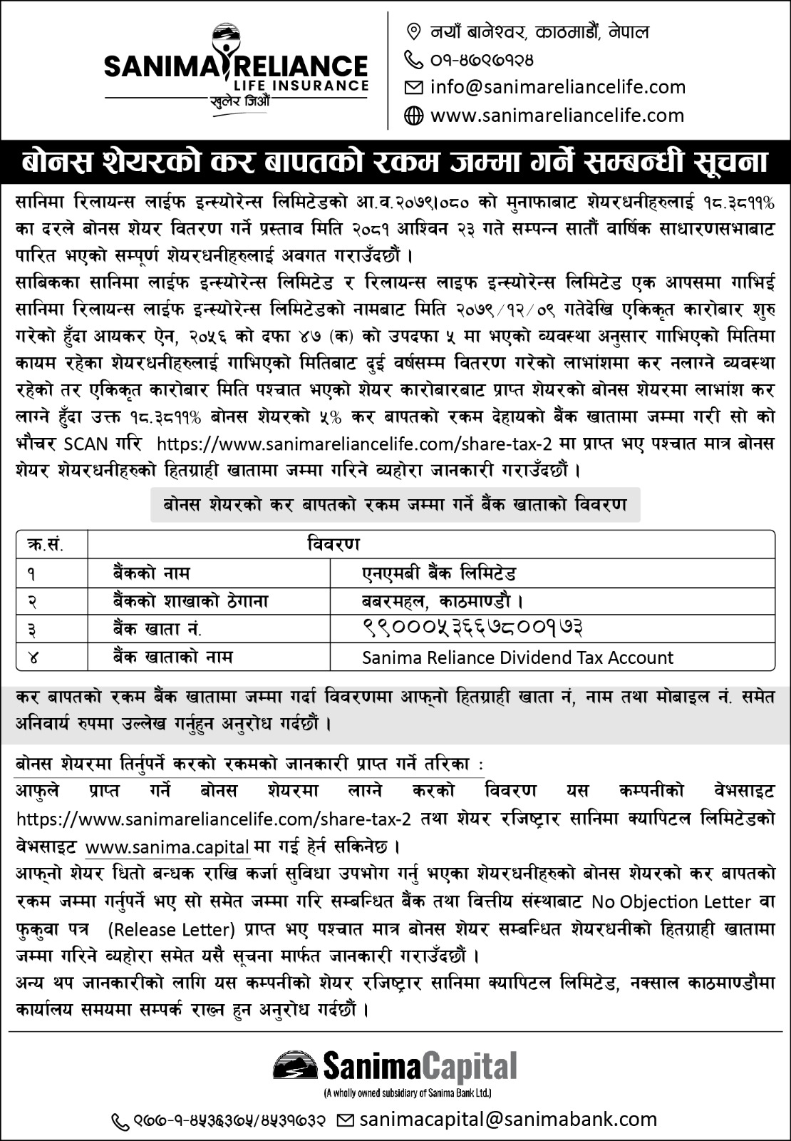 सोही प्रावधानबमोजिम उक्त १८.३८११ प्रतिशत बोनस शेयरको ५ प्रतिशत करबापतको रकम काठमाडौंको बबरमहलस्थित एनएमबि बैंकमा रहेको सानिमा रिलायन्स डेभिडेन्ड ट्याक्स अकाउन्ट (बैंक खाता नाम) ९९०००५३६६७८००१७३ जम्मा गर्न सकिने व्यवस्था गरिएको कम्पनील्े जनाएको छ। करबापतको रकम बैंक खातामा जम्मा गर्दा विवरणमा आफ्नो हितग्राही खाता नम्बर, नाम तथा मोबाइल नम्बरसमेत अनिवार्य रुपमा उल्लेख गर्न कम्पनीले आग्रह गरेको छ।