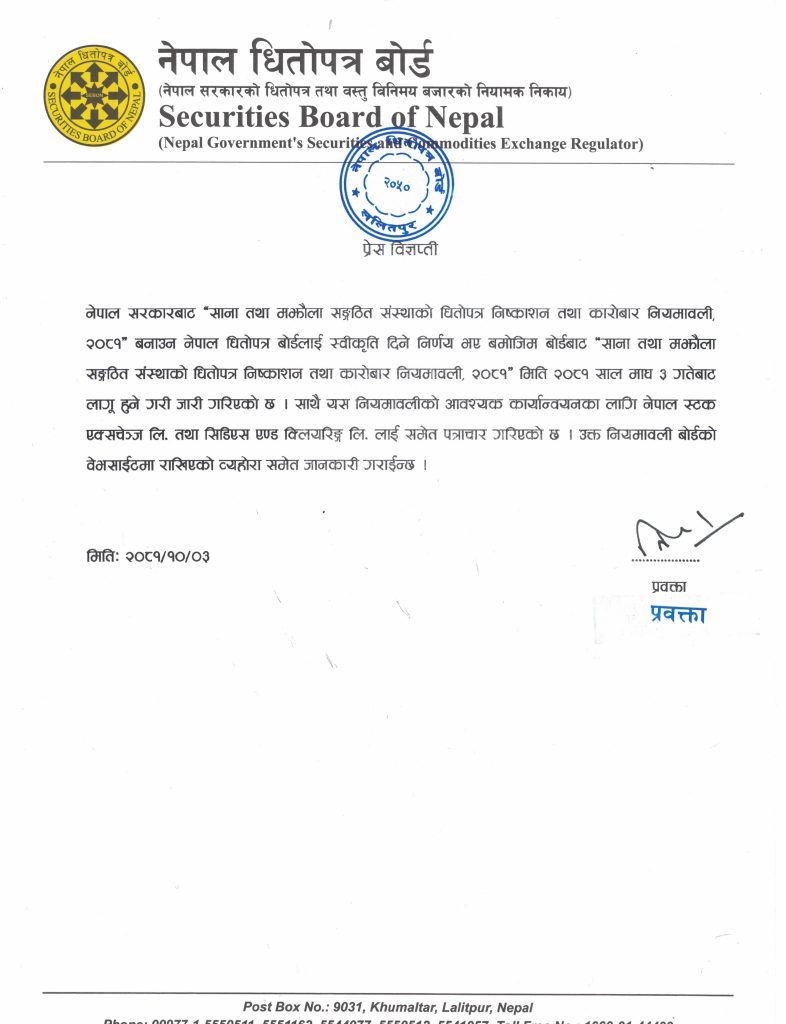 बैंकिङ खबर/ साना तथा मझौला कम्पनीको सेयर निष्कासन प्रक्रियाको लागि बाटो खुला भएको छ। सेयर निष्कासनको लागि नेपाल धितोपत्र बोर्डले साना तथा मझौला संगठित संस्थाको धितोपत्र निष्कासन तथा कारोबार नियमावली जारी गरेको छ।