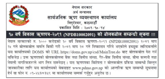 ऋणपत्र यही माघ १५ गते बोलकबोलमार्फत बिक्री गरी १८ गते निष्काशन हुनेछ। ऋणपत्रको बोलकबोलमा बैंक तथा वित्तीय संस्था, गैरबैंक वित्तीय संस्था, बीमा कम्पनी तथा नेपाली नागरिकहरुले भाग लिन सक्ने कार्यालयले जनाएको छ।