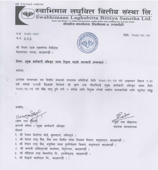 बैंकिङ खबर/स्वाभिमान लघुवित्त वित्तीय संस्था लिमिटेडको प्रमुख कार्यकारी अधिकृतमा कृष्णराज चौधरीलाई नियुक्त गरिएको छ । उनलाई कम्पनीले फागुन १ गतेदेखि लागु हुनेगरी आगामी चार वर्षको लागि प्रमुख कार्यकारी अधिकृत पदमा नियुक्त गरेको छ ।