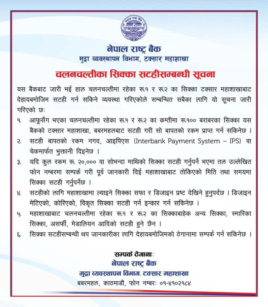 ती सिक्का टक्सार महाशाखाबाट साट्न सकिनेछ। सूचनामा उल्लेख भएअनुसार आफूसँग चलनचल्तीमा रहेका १ र २ रुपैयाँका कम्तीमा १०० रुपैयाँ बराबरका सिक्का सटही गरेर सोबापत रकम प्राप्त गर्न सकिन्छ। सटहीबापतको रकम नगद, आईपीएस वा चेकमार्फत भुक्तानी दिइने महाशाखाले जनाएको छ।