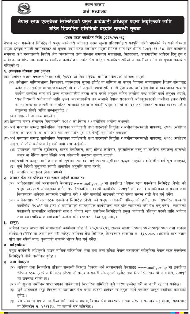 बैंकिङ खबर/अर्थ मन्त्रालयले नेपाल स्टक एक्सचेन्ज (नेप्से)को रिक्त प्रमुख कार्यकारी अधिकृत पदमा आवेदन माग गरेको छ। मन्त्रालयले सोमबार सूचना जारी गर्दै खुला प्रतिस्पर्धाको आधारमा छनौट गर्ने गरी आवेदन खुलाएको हो।