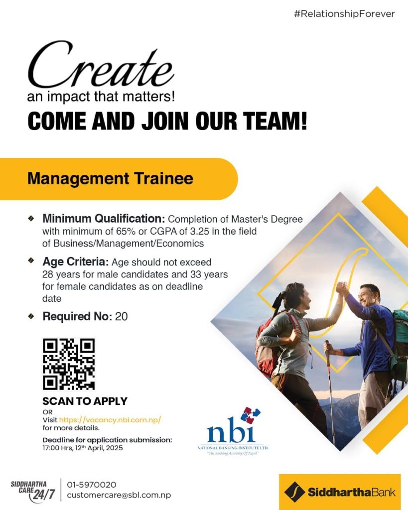 बैंकिङ खबर/ सिद्धार्थ बैंक लिमिटेडले कर्मचारी माग गरेको छ । बैंकले एक सूचना प्रकाशित गर्दै म्यानेजमेन्ट ट्रेनी पदमा २० जना कर्मचारी माग गरेको हो ।