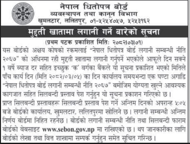 बोर्डले असार ५ गतेको कार्यालय समयभन्दा एक घण्टा अगाडि सिलबन्दी प्रस्ताव पेश गर्न आह्वान गरेको छ। प्रस्ताव पेश गर्दा एक वर्षे मुद्दती खातामा दिन सकिने ब्याज दर तथा लगानी सम्बन्धी नीतिअनुसार योग्यता खुल्ने कागजात संलग्न गर्नु पर्नेछ। उक्त सिलबन्दी प्रस्तावहरू सोही दिन अपरान्ह ५:०५ बजे बोर्डको कार्यालय खुमलटार, ललितपुरमा खोलिने जनाइएको छ।