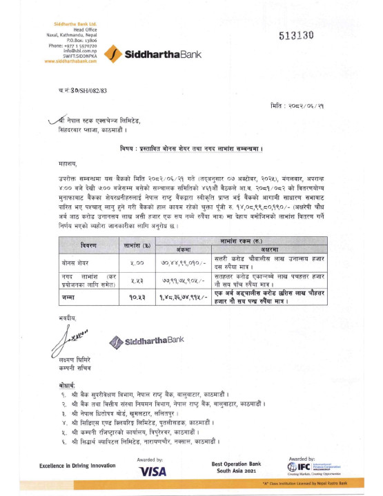 बैंकले चालु आर्थिक वर्षको नाफाबाट ५ प्रतिशत बोनस सेयर र ५.५३ प्रतिशत नगद लाभांश (करसहित) वितरण गर्ने निर्णय गरेको हो। यो प्रस्ताव नेपाल राष्ट्र बैंकको स्वीकृति र बैंकको आगामी वार्षिक साधारण सभाबाट पारित भएपछि मात्रै कार्यान्वयनमा आउनेछ।