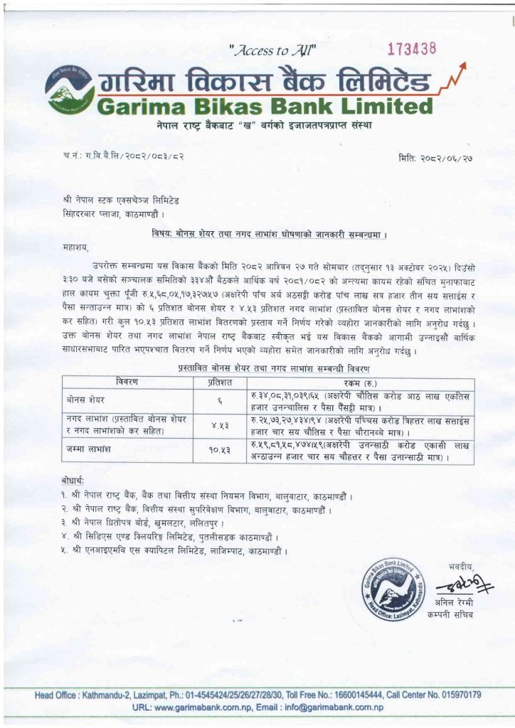 बैंकिङ खबर/ गरिमा विकास बैंकले सेयरधनीका लागि आर्थिक वर्ष २०८१/८२ को लाभांश घोषणा गरेको छ। बैंक सञ्चालक समिति बैठकले सञ्चित मुनाफाबाट सेयरधनीलाई हाल कायम चुक्तापुँजी ५ अर्ब ६८ करोड ५ लाख १७ हजार ३२७.५७ रुपैयाँको कुल १०.५३ प्रतिशत लाभांश वितरणको निर्णय गरेको हो।