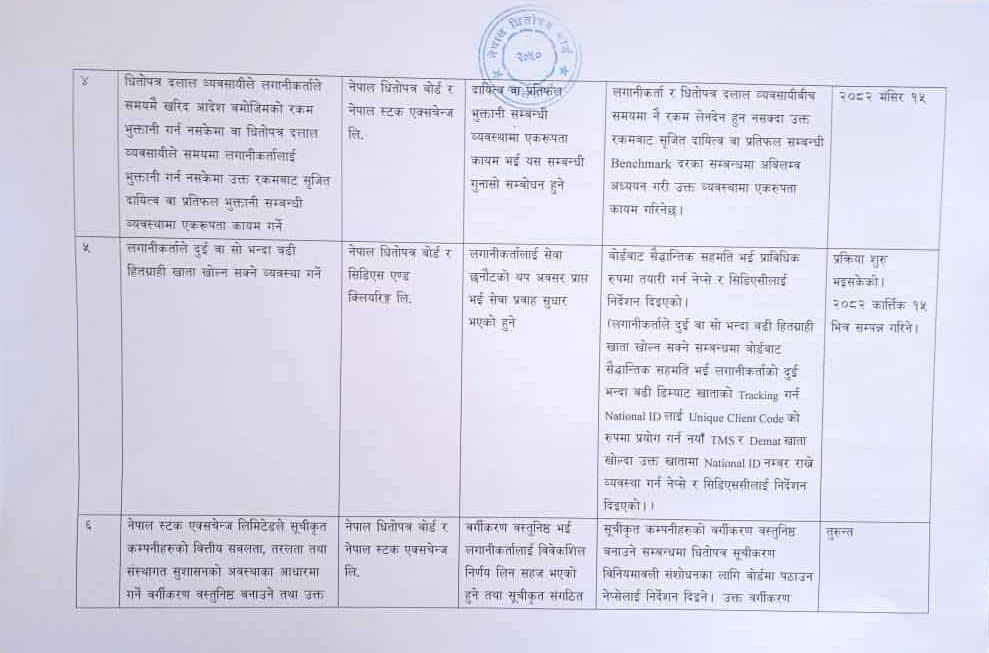 लगानीकर्ताले दुई वा त्योभन्दा बढी हितग्राही खाता खोल्न सक्ने व्यवस्था प्रक्रिया शुरू भइसकेकाले आउँदो कात्तिक १५ गतेभित्र सम्पन्न गर्ने र धितोपत्र दलाल व्यवसायीले लगानीकर्ताले समयमै खरिद आदेश बमोजिमको रकम भुक्तानी गर्न नसकेमा वा धितोपत्र दलाल व्यवसायीले समयमा लगानीकर्तालाई भुक्तानी गर्न नसकेमा त्यो रकमबाट सृजित दायित्व वा प्रतिफल भुक्तानी सम्बन्धी व्यवस्थामा एकरुपता कायम गर्ने काम मङ्सिर १५ गतेसम्ममा गरिने कार्ययोजनामा उल्लेख छ ।