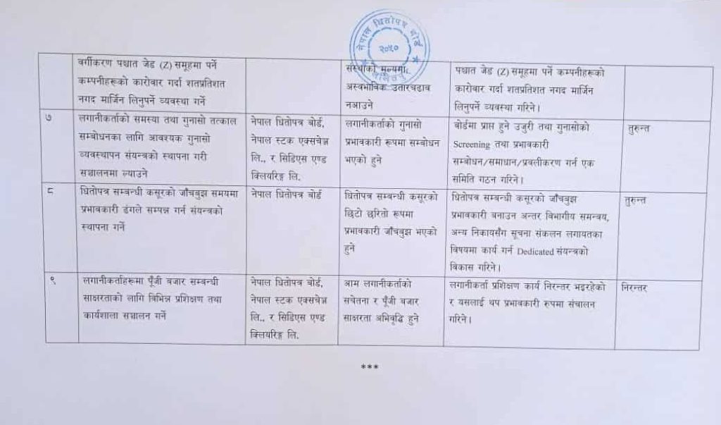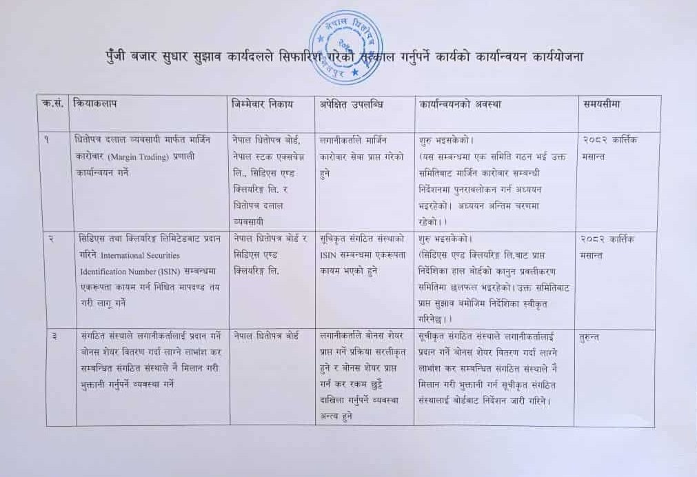 कार्ययोजनामा धितोपत्र दलाल व्यवसायीमार्फत मार्जिन कारोबार प्रणाली कार्यान्वयन आउँदो कात्तिक मसान्तसम्ममा गर्ने समयसीमा तोकिएको छ । संगठित संस्थाले लगानीकर्तालाई प्रदान गर्ने बोनस सेयर वितरण गर्दा लाग्ने लाभांश कर सम्बन्धित संगठित संस्थाले नै मिलान गरी भुक्तानी गर्नुपर्ने व्यवस्था तुरुन्त लागू गर्ने भनिएको छ ।