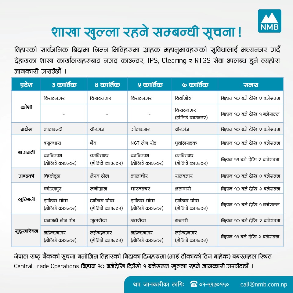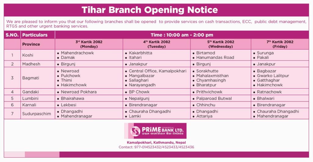 राष्ट्रिय वाणिज्य बैंक, नेपाल बैंक, एनआइसी एशिया बैंक, ग्लोबल आइएमई बैंक, नबिल बैंक, माछापुच्छ्रे बैंक, कुमारी बैंक, सिद्धार्थ बैंक लगायतका वाणिज्य बैंकहरूले तिहार अवधिभर सेवा सञ्चालन गर्ने शाखाहरूको सूची सार्वजनिक गरिसकेका छन्।