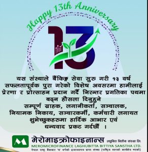 बैंकिङ खबर / मेरोमाइक्रोफाइनान्सले आफ्नो १३ औं वार्षिक उत्सव मनाएको छ । संस्थाले आफ्नो केन्द्रीय कार्यालय सहित देशैभरका शाखा कार्यालयहरुमा पनि वार्षिक उत्सव मनाएको छ । संस्था स्थापनाको १३ वर्षअघि नुवाकोटको बट्टारमा राष्ट्रिय स्तरको लघुवित्तको रुपमा स्थापना भएको हो ।