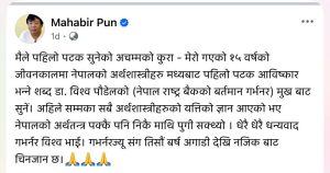 यही बीचमा अर्थतन्त्र सुधार गर्न गभर्नरले गरेका प्रयासहरुले केही आशाहरु जगाएका छन् । गभर्नर डा. विश्वनाथ पौलेलका कार्यहरु र उनका अभिव्यक्तिहरुको शिक्षामन्त्री महावीर पुनले पनि तारीफ गरेका छन् । गभर्नर पौडेलले बैंकवित्त मात्रै होइन उद्यमशीलता, व्यबसायी र समग्र अर्थतन्त्रका बारेमा सकारात्मक पहलहरु अघि बढाएको पाइन्छ । पछिल्लो समय जेन्जी आन्दोलनका कारण अर्थतन्त्रमा निराशाा छाएको छ । यो अबस्थालाई चिर्नका लागि गभर्नर पौडेलका भनाई र गराईले अर्थतन्त्रमा केही आशा जगाएको छ ।