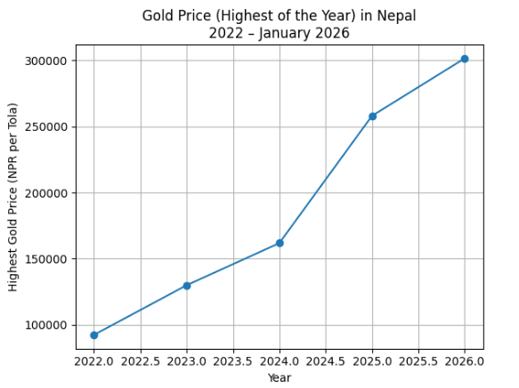२०२२ मा सुनको उच्चतम मूल्य करिब रु. ९२,५०० प्रतितोला मा सीमित थियो। २०२३ मा सुनको उच्चतम मूल्य रु. १,३०,००० प्रतितोला पुग्यो। यो २०२२ को तुलनामा उल्लेखनीय वृद्धि हो, जसले अन्तर्राष्ट्रिय बजारको दबाब र घरेलु मागमा भएको वृद्धिलाई प्रतिबिम्बित गर्छ। २०२४ मा सुनले फेरि नयाँ उचाइ छोयो र रु. १,६१,८०० प्रतितोला को उच्चतम दर कायम भयो। यस वर्षको वृद्धि अघिल्ला वर्षभन्दा तीव्र देखिन्छ, जसले सुनप्रतिको सुरक्षित लगानीको धारणा बलियो हुँदै गएको संकेत दिन्छ। २०२५ मा ग्राफमा सबैभन्दा तीव्र उकालो देखिन्छ। सुनको उच्चतम दैनिक मूल्य रु. २,५८,००० प्रतितोला पुगेको छ। यो एकै वर्षमा भएको असामान्य वृद्धि हो, जसले बजारमा संरचनागत परिवर्तन र उच्च अनिश्चितता रहेको देखाउँछ।