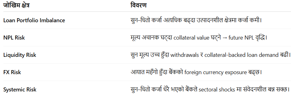 सुनको मूल्य बढ्दा बैंक तथा वित्तीय संस्थामा सुन धितो कर्जा को आकर्षण बढेको देखिन्छ। सुनको मूल्य स्थिर वा बढ्दो हुँदा यस्तो कर्जा बैंकका लागि कम जोखिमयुक्त मानिन्छ। तर अत्यधिक सुन–आधारित कर्जाले बैंकिङ कर्जाको संरचना असन्तुलित बनाउन सक्छ।