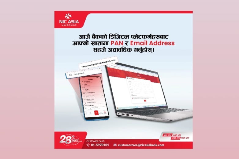 बैंकिङ खबर / एन आई सी एशिया बैंकले आफ्ना ग्राहकहरूलाई आफ्नो खातामा स्थायी लेखा नम्बर (PAN) र ईमेल ठेगाना (Email Address) अद्यावधिक गर्न अनुरोध गर्दछ । बैंकका ग्राहकहरूको खाताबाट गरिएको करकट्टीको विवरण “आयकर ऐन २०५८” बमोजिम नेपाल सरकार, अर्थ मन्त्रालय, आन्तरिक राजश्व विभागद्वारा जारी गरिएको स्थायी लेखा नम्बर प्रणालीमा आवद्ध गर्नुपर्ने भएकोले ग्राहकहरूले बैंकको पोर्टल panupdate.nicasiabank.com वा मोबाइल बैंकिङ्ग एप (NIC ASIA MoBank) मा रहेको “PAN Update” Option मा ट्याप गरी आफ्नो प्यान यथाशीघ्र अद्यावधिक गर्न सक्नुहुनेछ ।