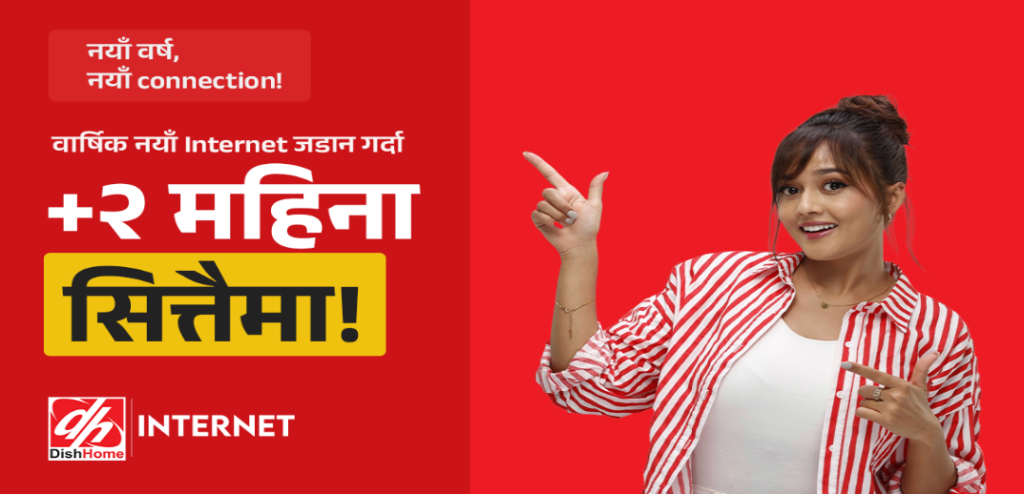 नयाँ जडानका लागि नजिकको डिशहोम डिलर वा ०१-५९७०३६५ मा सम्पर्क गर्नुहोस्। डिशहोम सधैं ग्राहकलाई उत्कृष्ट सेवा र थप मूल्य प्रदान गर्ने प्रतिबद्धतासाथ अघि बढ्दै आएको छ। नयाँ वर्षको यस विशेष योजनासँगै डिशहोम इन्टरनेटले आफ्ना ग्राहकहरूलाई गुणस्तरीय सेवा प्रदान गर्ने प्रतिबद्धतालाई अझ मजबुत बनाएको छ।