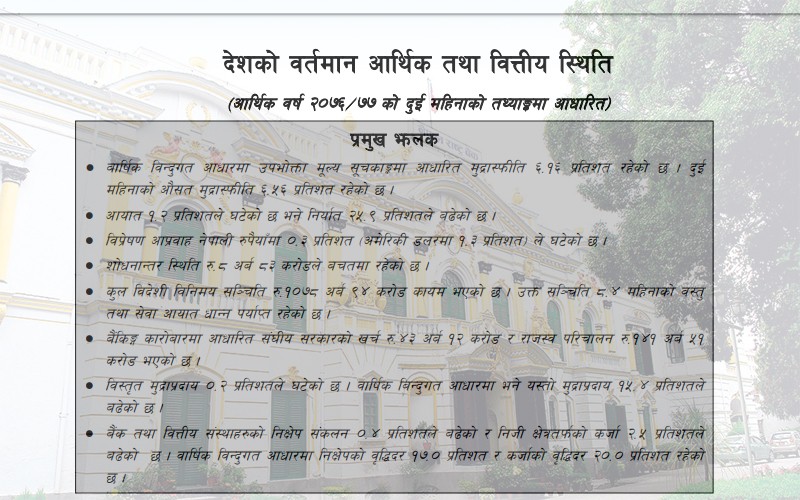 २७. आर्थिक वर्ष २०७६।७७ को दोस्रो महिनामा बैंकिङ्ग कारोबारमा आधारित सरकारको वित्त स्थिति रु.१०५ अर्ब ५ करोडले बचतमा रहेको छ । अघिल्लो वर्षको सोही अवधिमा सरकारी वित्त स्थिति रु.५५ अर्ब ९३ करोडले बचतमा रहेको थियो ।