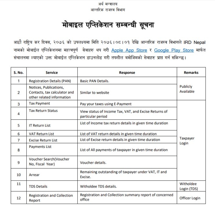 विभागको आइआरडी नेपाल नामक मोबाइल एप एप्पल स्टोर र गुगल प्ले स्टोरमा उपलब्ध छ । एपमा भएका फिचरलाई सबैले हेर्न मिल्ने, करदाताले लगइन गरी हेर्नसक्ने र विभागको आधिकारिक युजरले हेर्नसक्ने गरी ३ भागमा वर्गीकृत गरिएको छ । जसमध्ये करदाताको दर्ता र कर संकलन सम्बन्धी विस्तृत विवरण आधिकारिक युजरले मात्रै हेर्न मिल्छ । त्यसैगरी प्यान डिटेल सर्च गर्ने तथा विविध सूचना र जानकारी लिने कार्य सबै एप प्रयोगकर्ताले गर्नसक्ने व्यवस्था छ