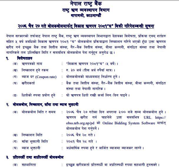 बैंक तथा वित्तीय संस्था, गैर बैंक वित्तीय संस्था, बीमा कम्पनी, सङ्गठित संस्था तथा नेपाली नागरिकलाई आज दिँउसो ३ बजेसम्म बोलकबोल गरेर उक्त ऋणपत्र बिक्री गरिने छ ।