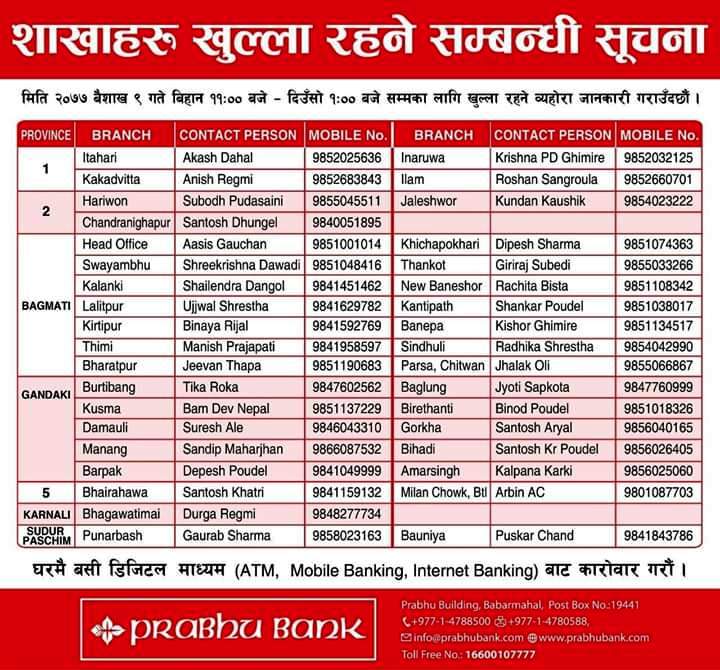 आज प्रभु बैंकको कुन-कुन शाखा खुल्दैछन् ? बैंकिङ खबर । प्रभु बैंकको आज उपत्यका भित्र र बाहिर गरी बिभिन्न ठाउँका शाखाहरु खुल्ला रहनेछन् । उक्त शाखाहरु ११ बजेदेखि १ बजेसम्म खुल्ने बताइएको छ ।
